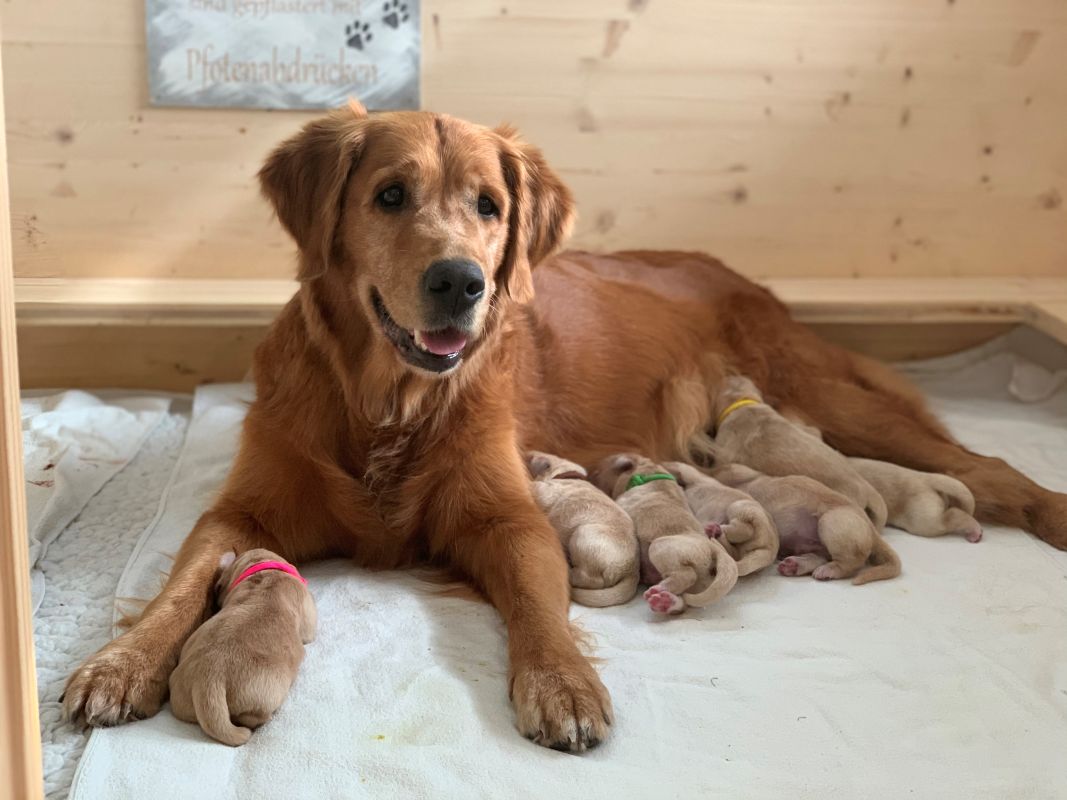 Den 5 Rüden und den 2 Hündinnen geht es sehr gut und Aileen, als reife Hündin geniesst erneut ihr Muttersein mit Leib und Seele. Zusammen mit Carmen und Andreas Sellmer haben wir mit voller Spannung auf diesen Wurf gewartet. Für Enrico als Papa ist es der erste Wurf und es ist einfach wundervoll, dass die Natur uns so reich beschenkt hat.